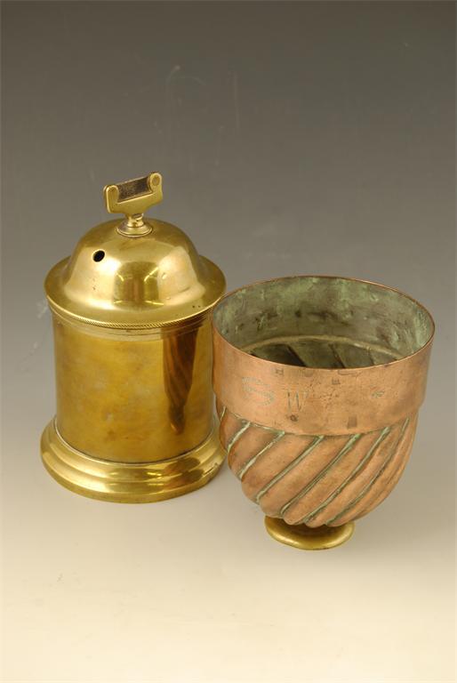 A Victorian brass string box, of cylindrical form, the bayonet fixing cover pierced and with a steel blade, 7in (18cm) h.