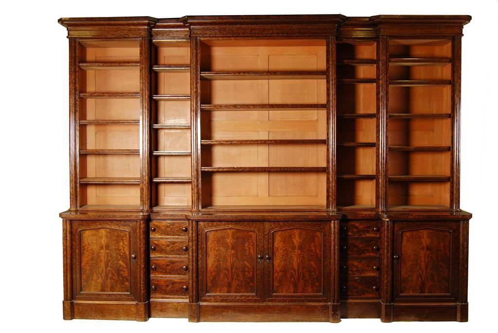 A late Regency plum-pudding mahogany breakfront library bookcase, with a detachable moulded cornice above adjustable shelves in five bays with cluster column supports, the crossbanded base with a pair of central arched panel doors enclosing sixteen drawers of varying depths, fitted wood knob handles, flanked by banks of four drawers with cedar linings and fitted wood knob handles and a further pair of panel doors, each enclosing ten drawers with wood knob handles, all flanked by cluster columns on a deep plinth, 110in (279.5cm) h, 152in (385.5cm) w, 26.5in (67cm) d.
