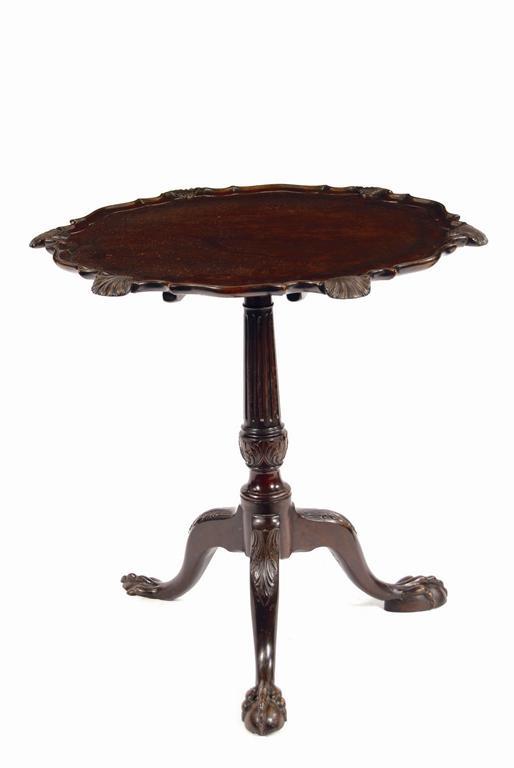 A 19th century mahogany tripod table, the shaped top with raised moulded edge with shells on a leaf carved and fluted stem to conforming cabriole legs to claw and ball feet, one part missing, 28.25in (72cm) h, 28.5in (72.5cm) dia.