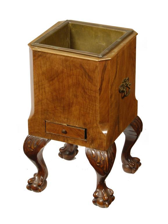 A walnut jardiniere, with a lift out brass liner, side carrying handles with a later drawer, on carved claw on ball feet, 18.75in (47.4cm0 h, 10.75in (27.2cm) w. Damages to drawer.