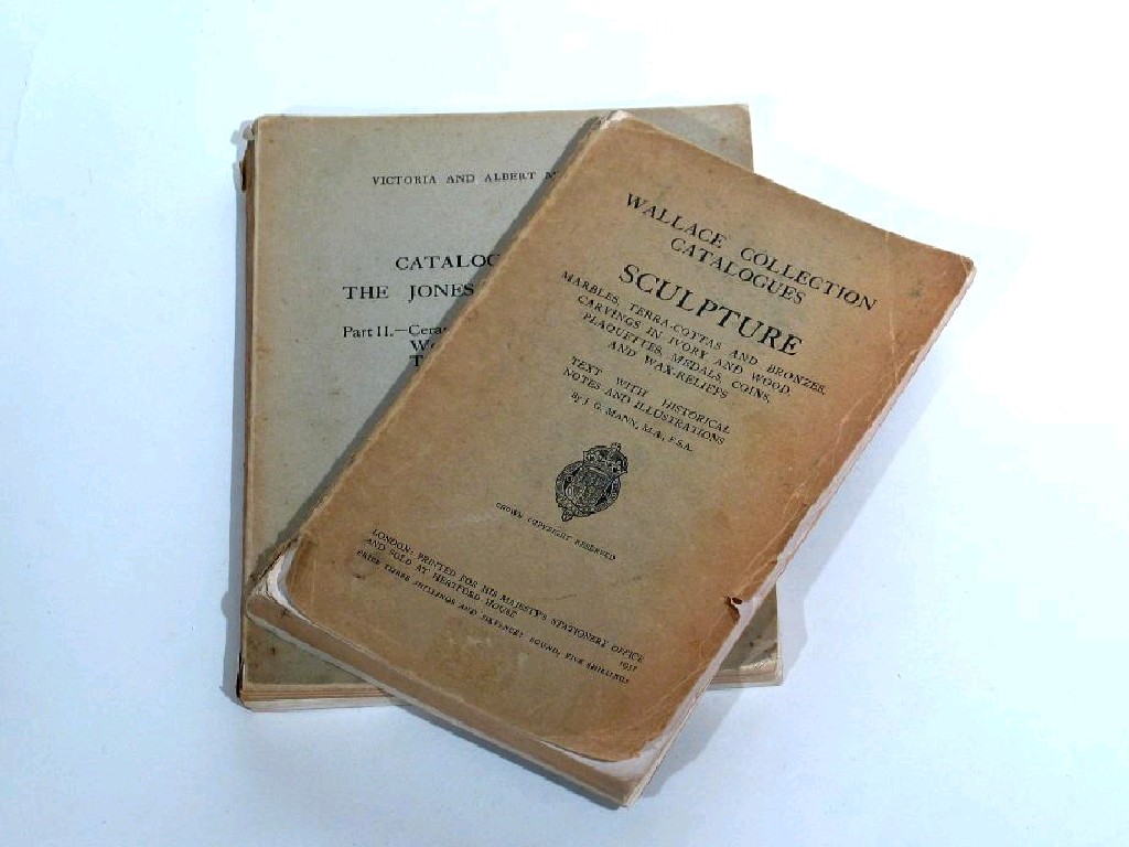 Two pre-war catalogues: The Wallace Collection catalogue of Sculpture (marbles, terracottas and bronzes, carvings in ivory and wood, plaquettes, medals, coins and wax reliefs) HM"O 1931 and The Jones Collection, Part II, ceramics, Ormolu, Goldsmith's work, enamels, sculpture, tapestry, books and prints. V&A 1924. (2)