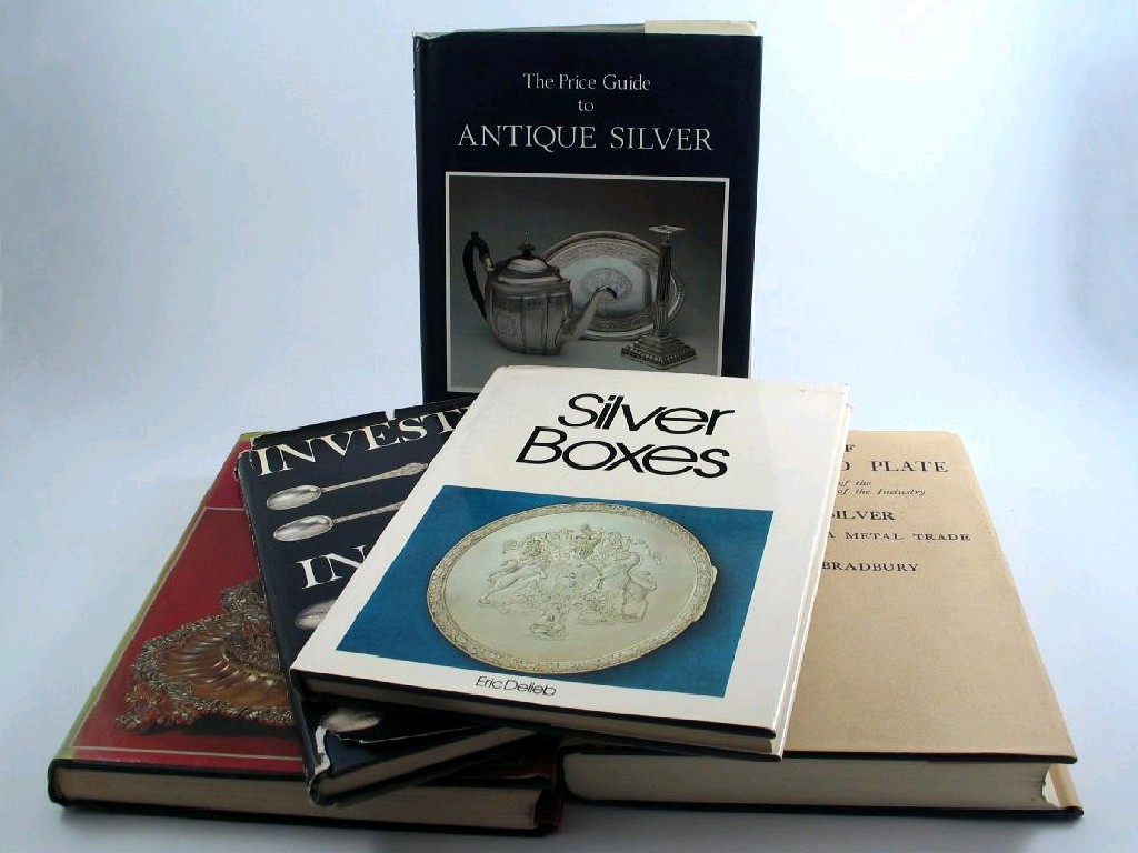 Five assorted volumes of silver and plated wares, Waldron's price guide to antique silver, Clayton's dictionary of silver and gold, Delieb's investing in silver & silver boxes and Bradbury's History of Old Sheffield plate. (5)
