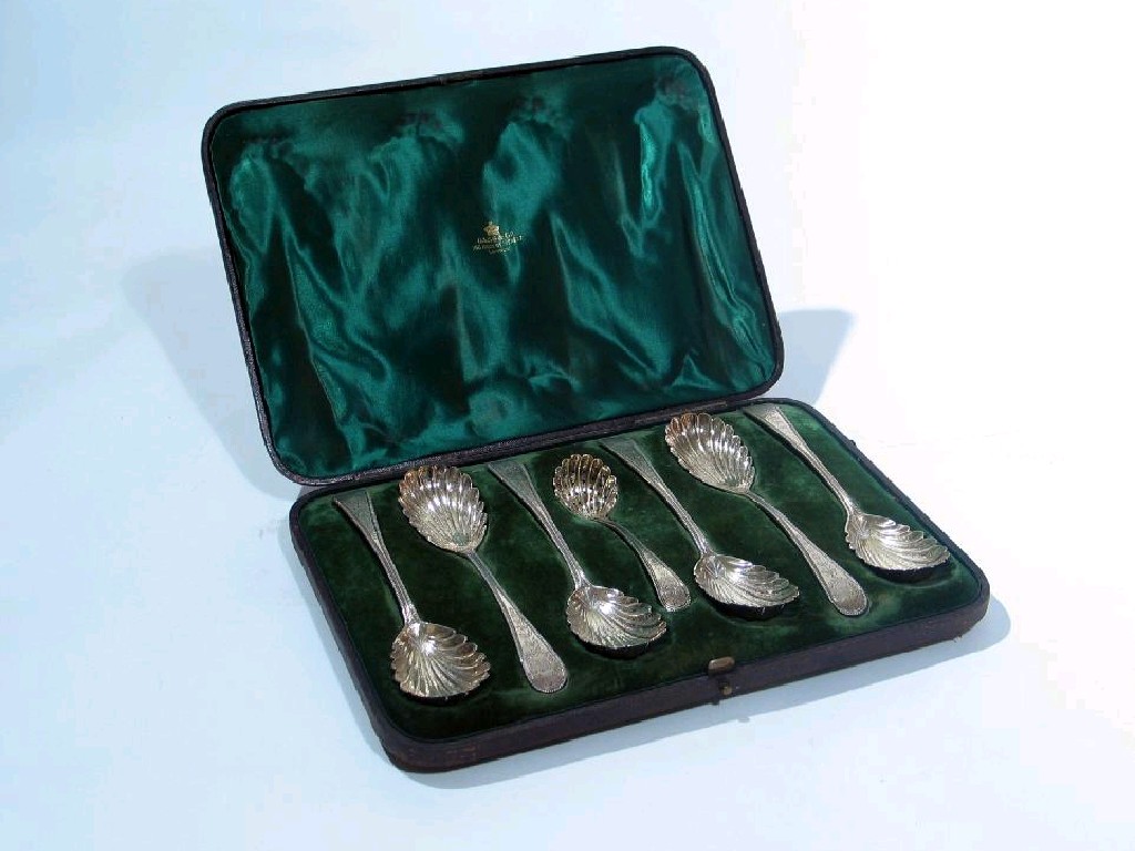 A Victorian cased set of six fruit serving spoons and a sugar sifter ladle with bead borders and...