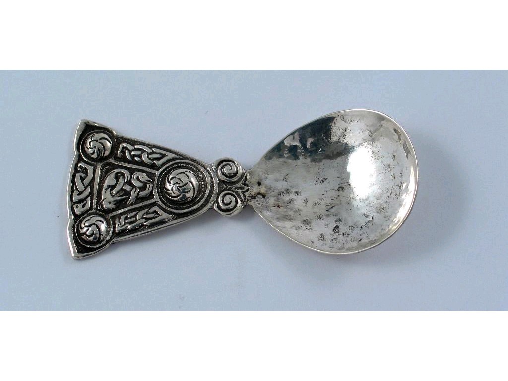 A caddy spoon, of Celtic design, maker S & Co, Chester 1947.