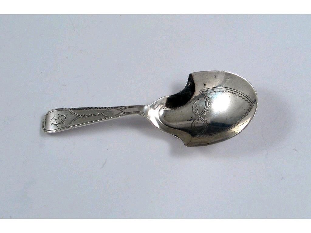 Double duty mark: a George III caddy spoon with a waisted bowl and pricked engraving, by Joseph Taylor, Birmingham 1797.