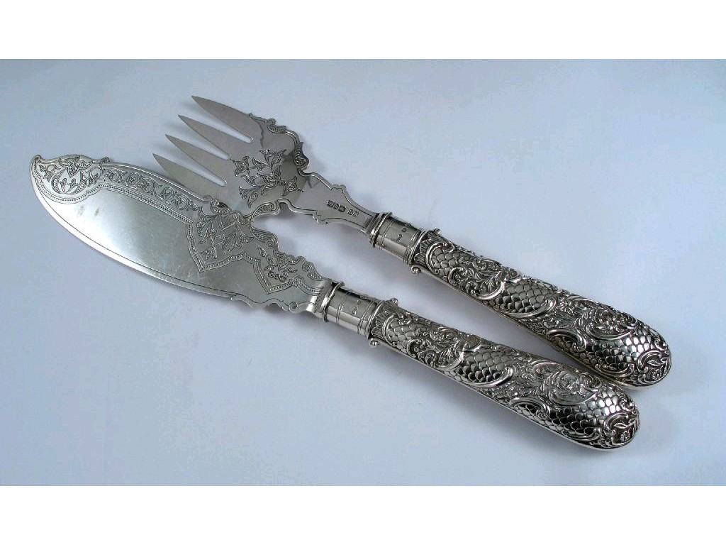 A pair of late Victorian engraved fish carvers, with embossed handles, decorated with a scale design and floral scrolls, by H. Matthews, Birmingham 1894 (loaded). (2)