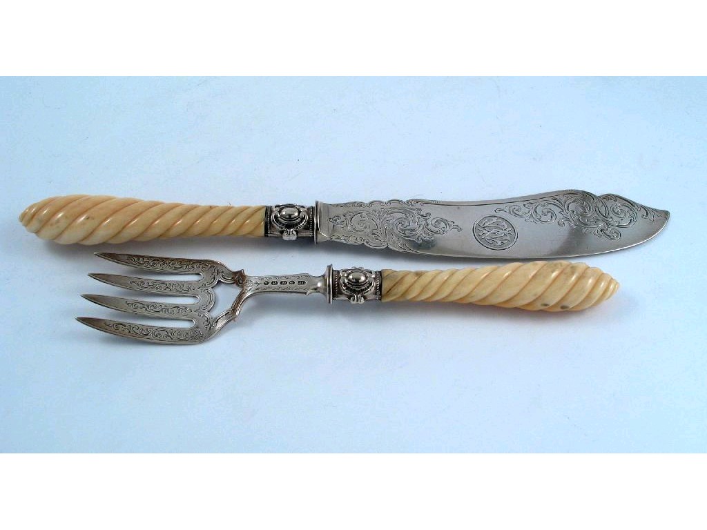A cased pair of Victorian engraved fish carvers, with wrythen fluted, ivory handles, by J. Gloster, Birmingham 1872.