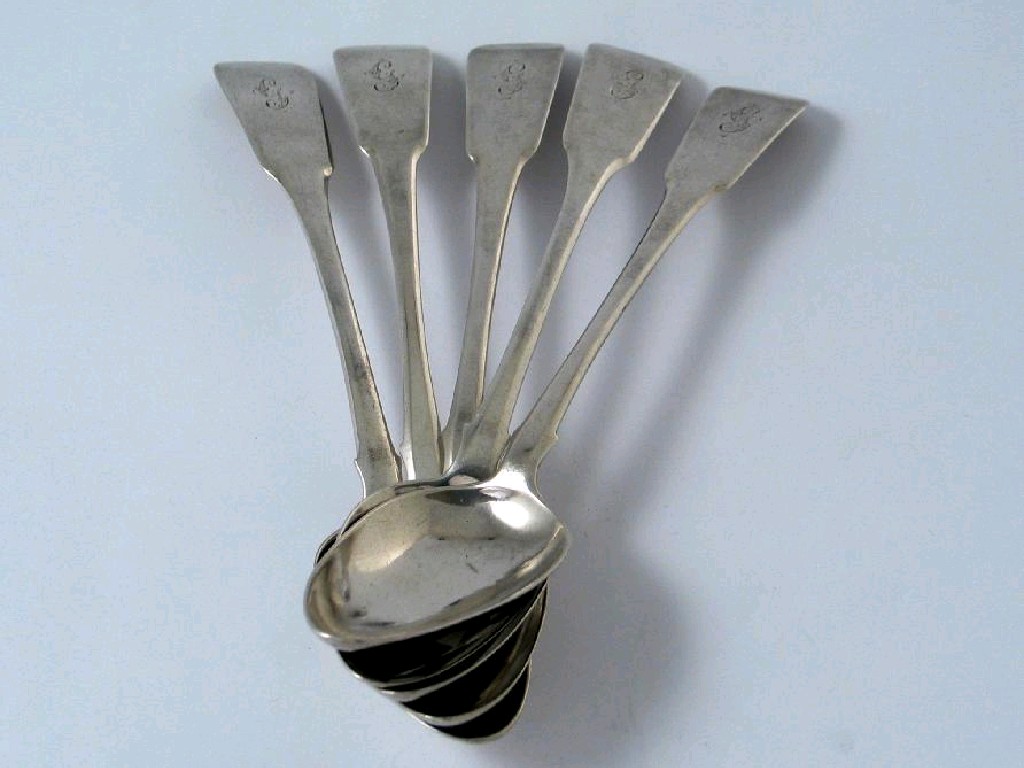 A matching set of five Victorian Scottish provincial fiddle pattern dessert spoons