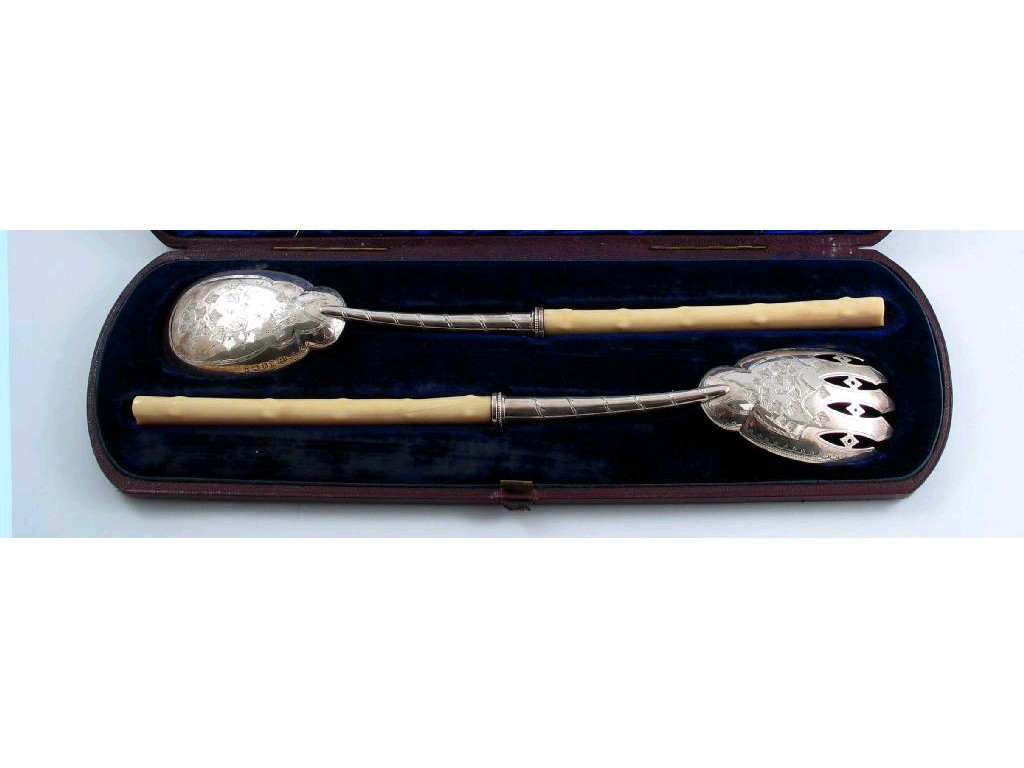 A Victorian cased pair of engraved salad servers, knobbly, ivory handles by Atkin Bros, Sheffield 1875.