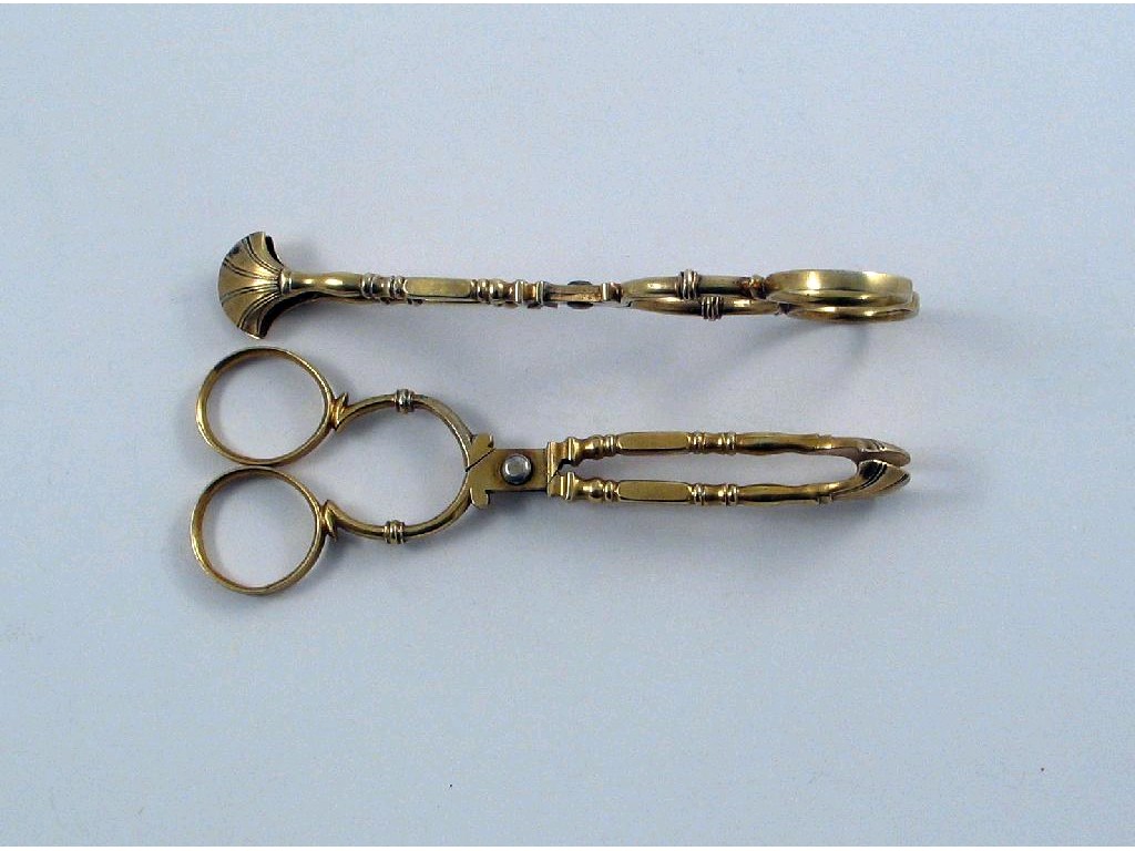 Two pairs of silver gilt sugar nips, with fan shaped bowls and turned arms, unmarked except for a 19th century Dutch duty mark struck once on each pair. Probably 18th century, probably Dutch/low countries, approx 4.4in (11cm) long, 1.5oz. (2)