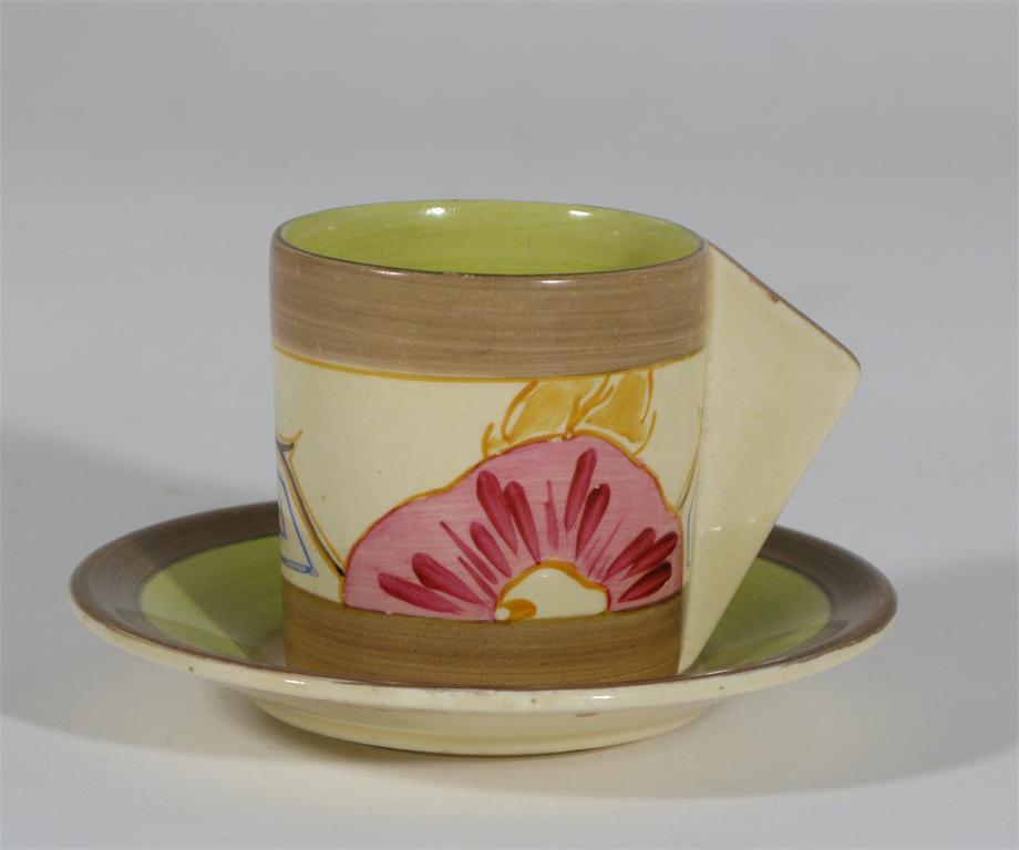'Hollyrose' a Clarice Cliff Bizarre Conical coffee can and saucer painted in colours printed...