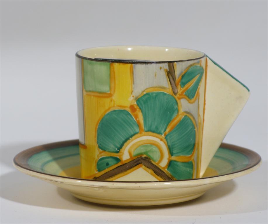'Moonflower' a Clarice Cliff Bizarre coffee can and saucer painted in colours printed factory marks
