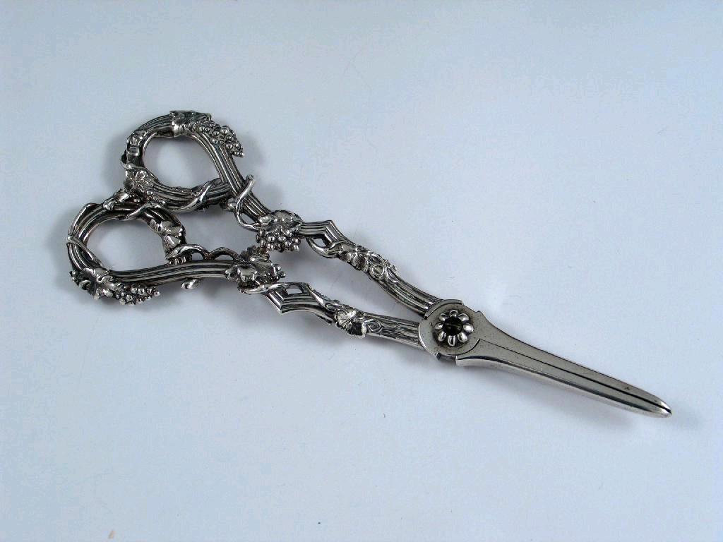 A pair of Victorian grape shears, with cast openwork vine handles, crested, by Francis Higgins, London 1849, 7.25in (18.25cm) long, 4.75oz.