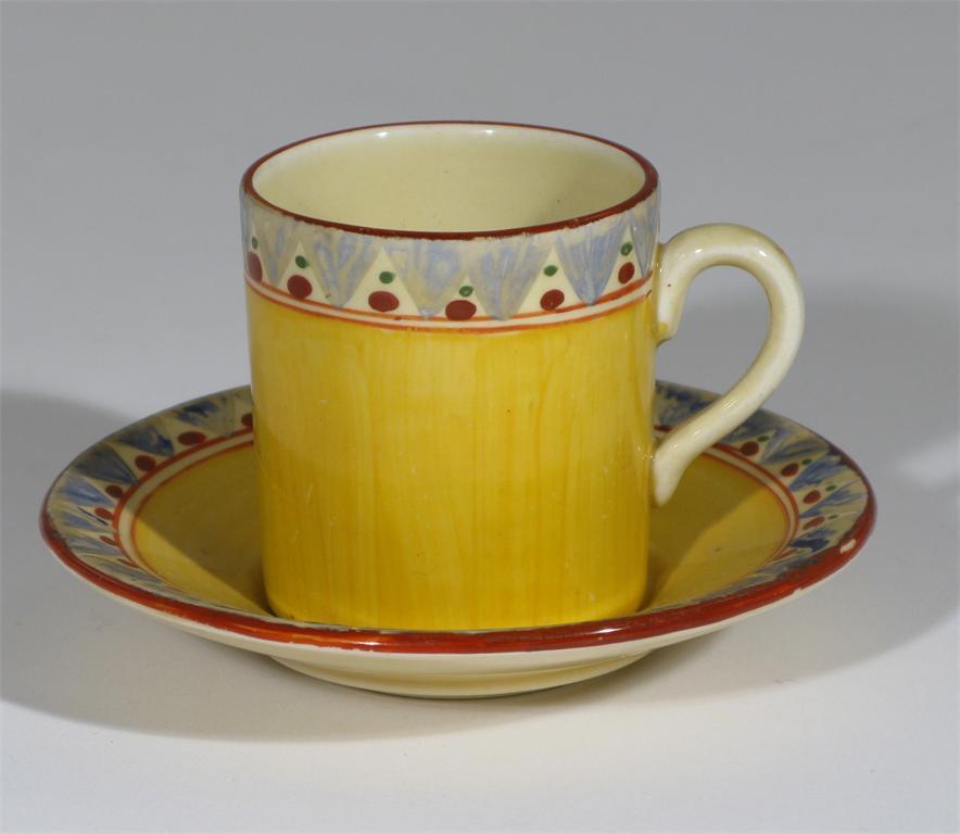 'Original Bizarre' a Clarice Cliff Tankard coffee can and saucer painted with a simple band of...