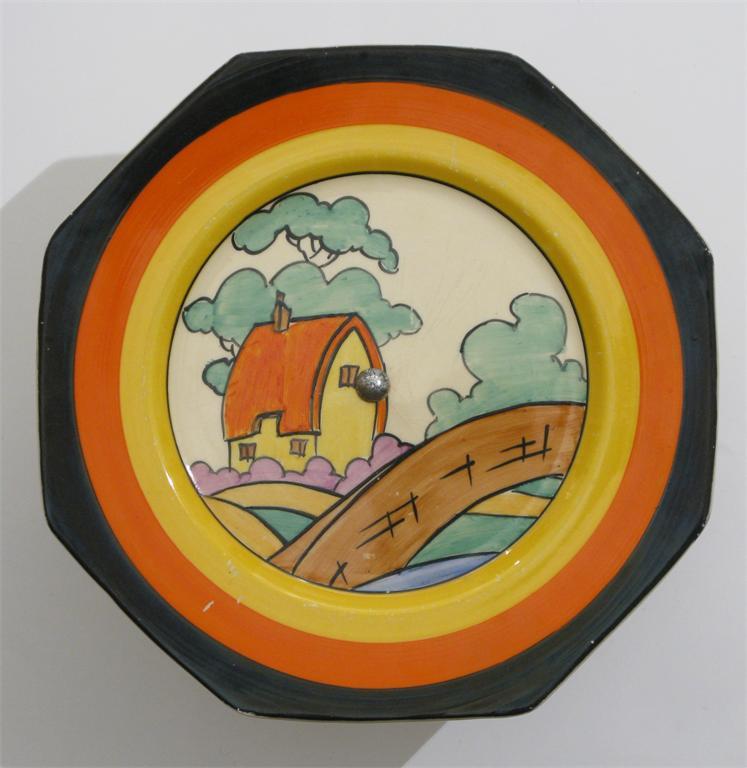 'Orange Roof Cottage' a Clarice Cliff Bizarre cake plate painted in colours inside yellow