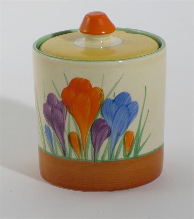 'Crocus' a Clarice Cliff cylindrical preserve pot and cover painted in colours printed factory...