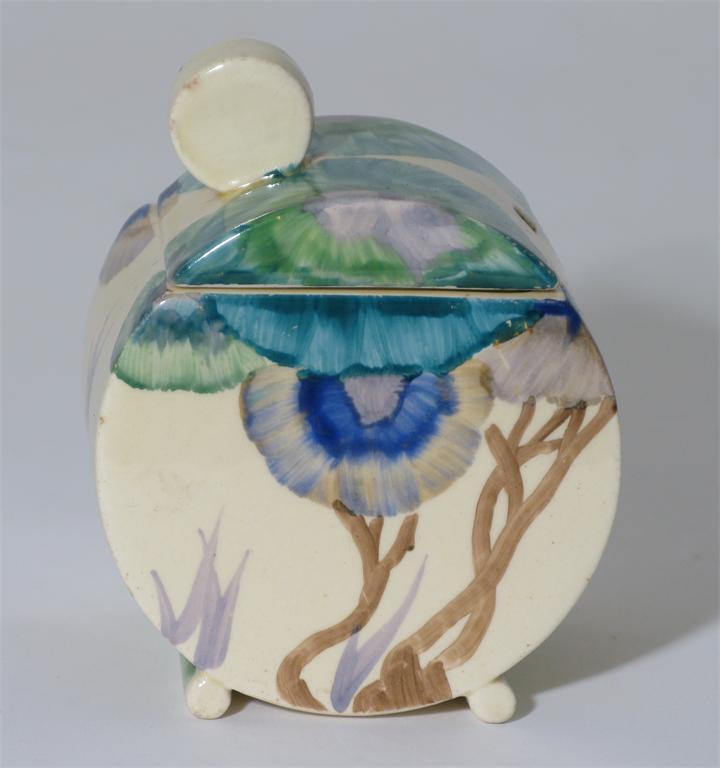'Viscaria' A Clarice Cliff Bizarre Bon Jour preserve pot and cover painted in colours printed...