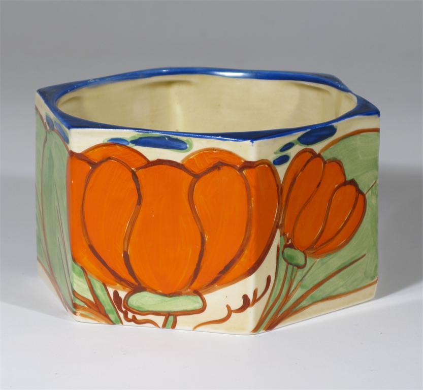 'Orange Lily' a Clarice Cliff Fantasque Bizarre hexagonal bowl painted in colours printed factory...
