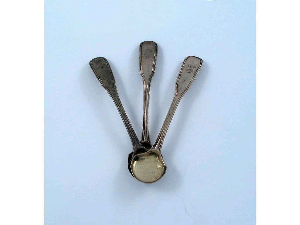 Three rare fiddle thread and drop salt spoons