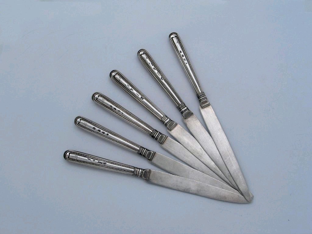 Six 19th century Danish fruit/dessert knives with thread pattern handles