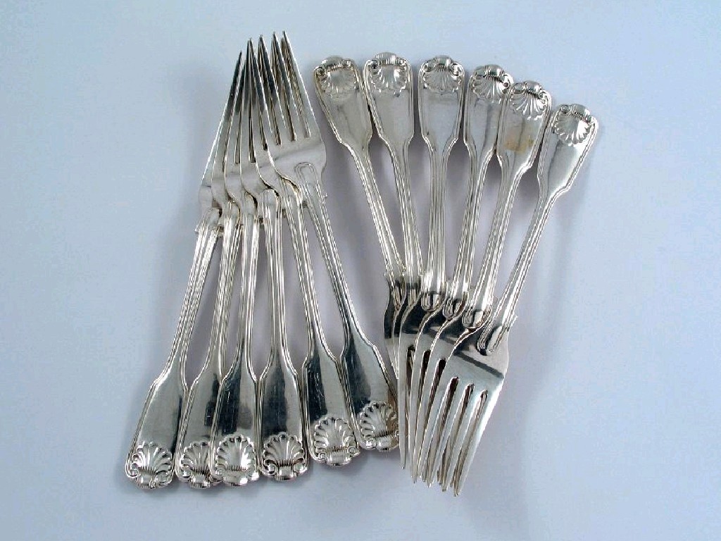Two sets of 6 Victorian fiddle thread and shell pattern dessert forks: one set by Elizabeth Eaton