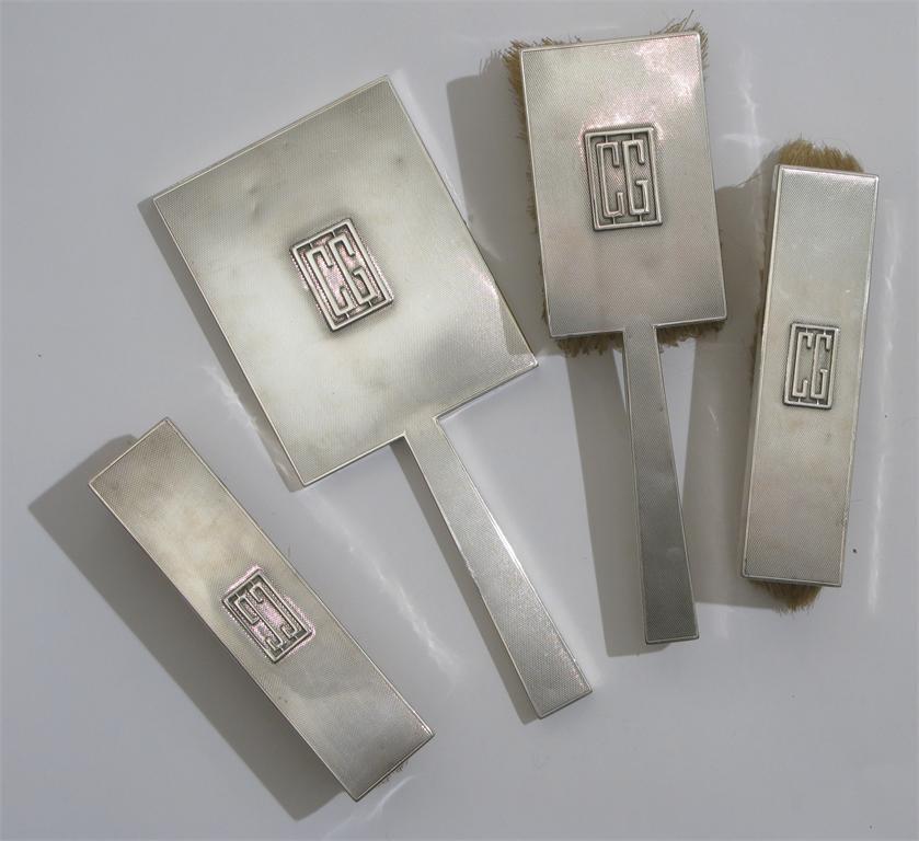 A Mappin & Webb silver dressing table set, angular, engine turned decoration, comprising; hand-mirror and three various brushes stamped marks, Birmingham 1936 25 cm. high