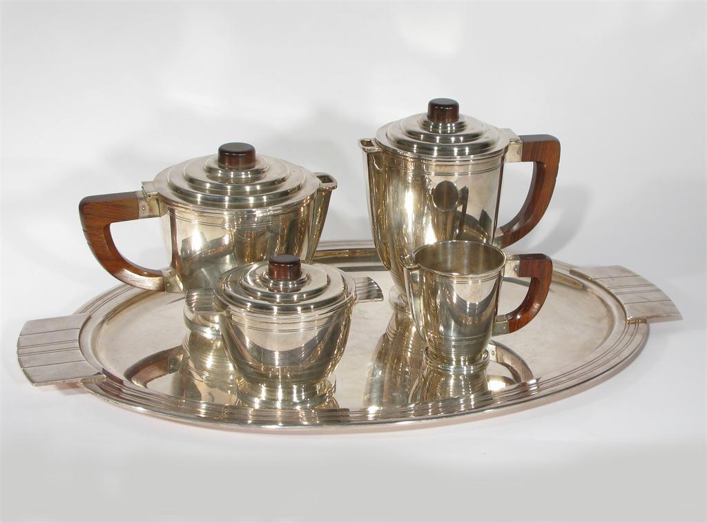 An Art Deco continental white metal and rosewood four piece tea set, comprising; teapot, hot-water pot, milk-jug and covered sugar basin, on twin-handled tray stamped BB mark tray 54.5cm. wide