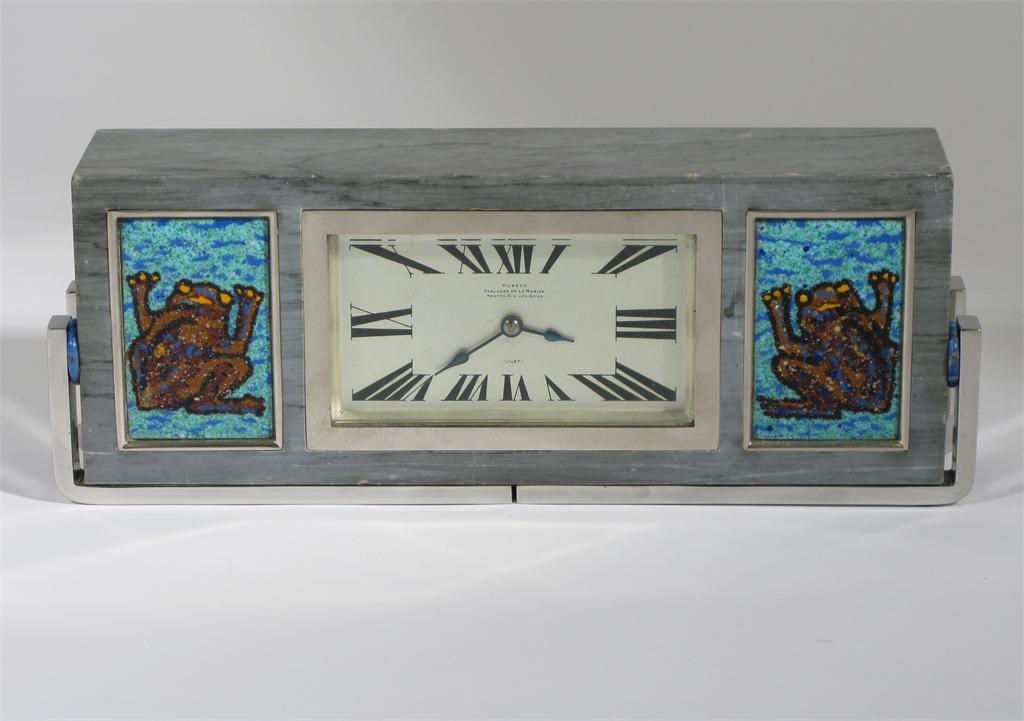 A Husson, Menton Aix Les Bains Just marble and chromed metal mantel clock rectangular section, the marble inset with two enamel panels, the chrome with four lapis discs signed to the clock front 33.5 cm. wide