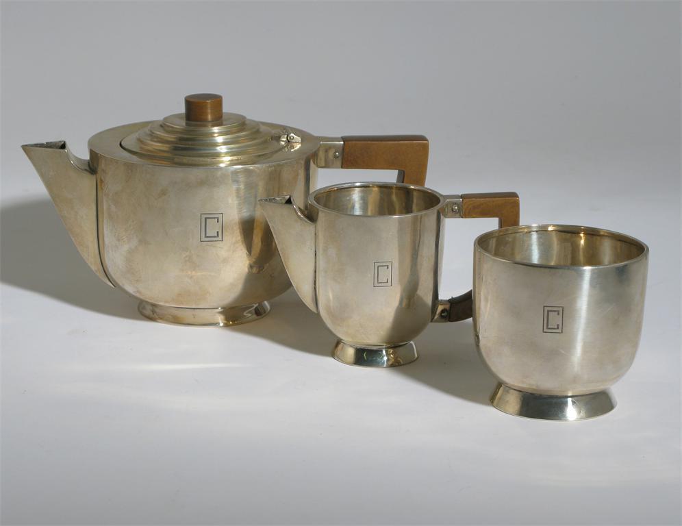 A Charles Boyton three piece silver tea set, comprising teapot and hinged cover, milk-jug and sugar basin, with bakelite handles stamped marks, London 1934, facsimile signature teapot 12cm. high
