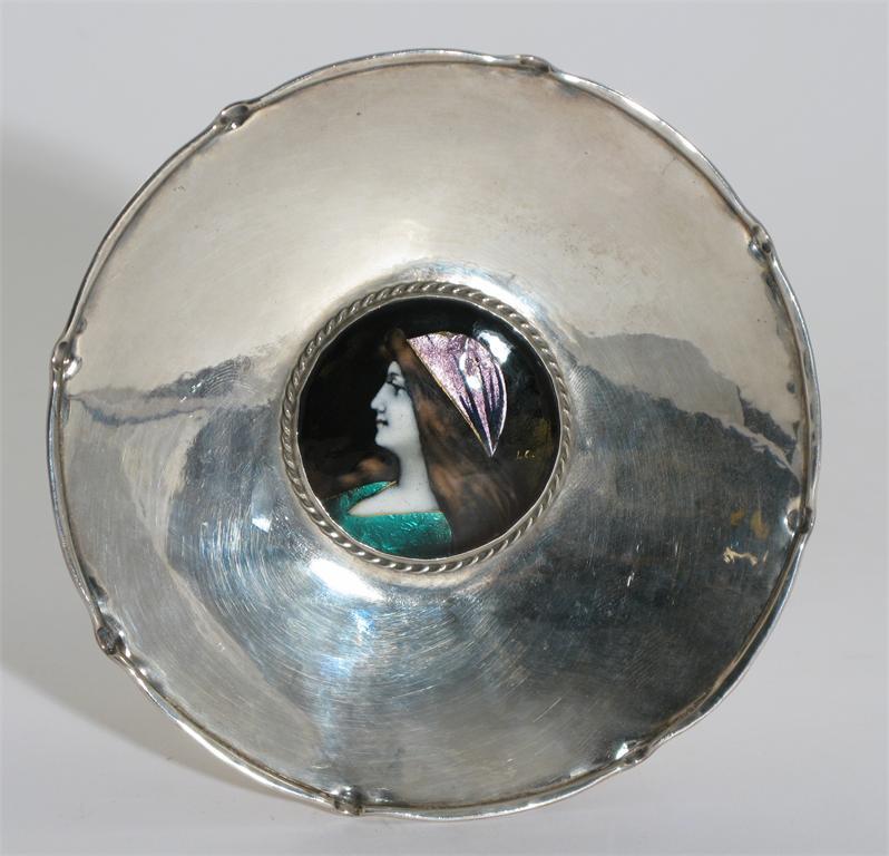 An unusual Omar Ramsden silver and Limoges enamel salver circular with pinched rim