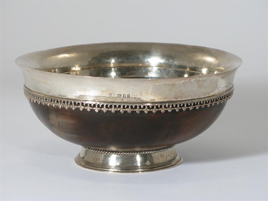 An Omar Ramsden silver and walnut Mazer bowl with flaring silver rim applied with pierced foliate...
