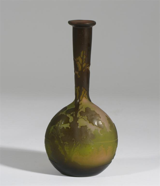 An Art Nouveau Galle cameo glass solifleur vase mottled pink ground overlaid with yellow and...