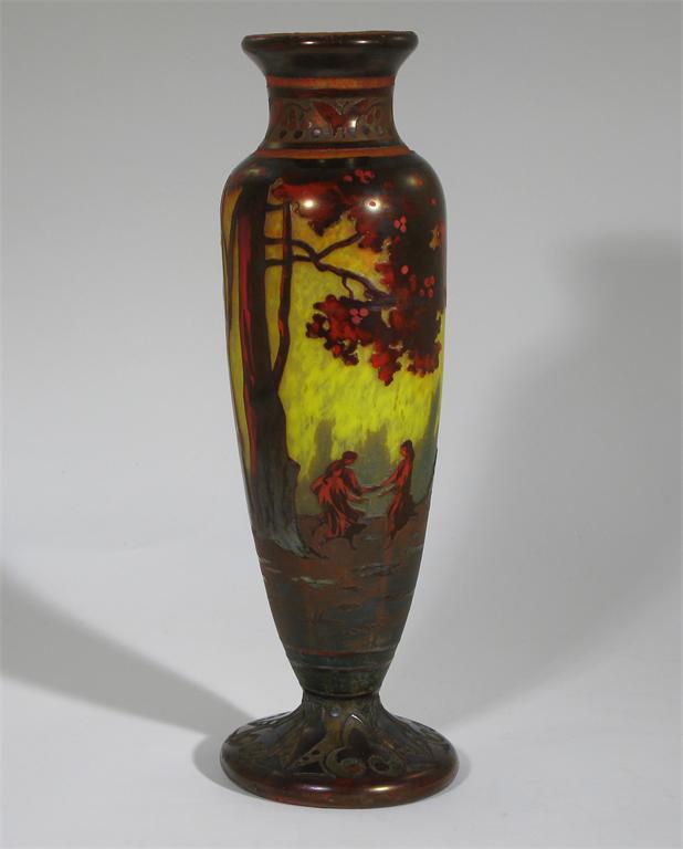An Art Nouveau Muller Fres cameo glass vase shouldered form, yellow glass overlaid with red with cameo figures in a wooden landscape,, between geometric and butterfly borders cameo Muller Fres Luneville signature 36 cm. high