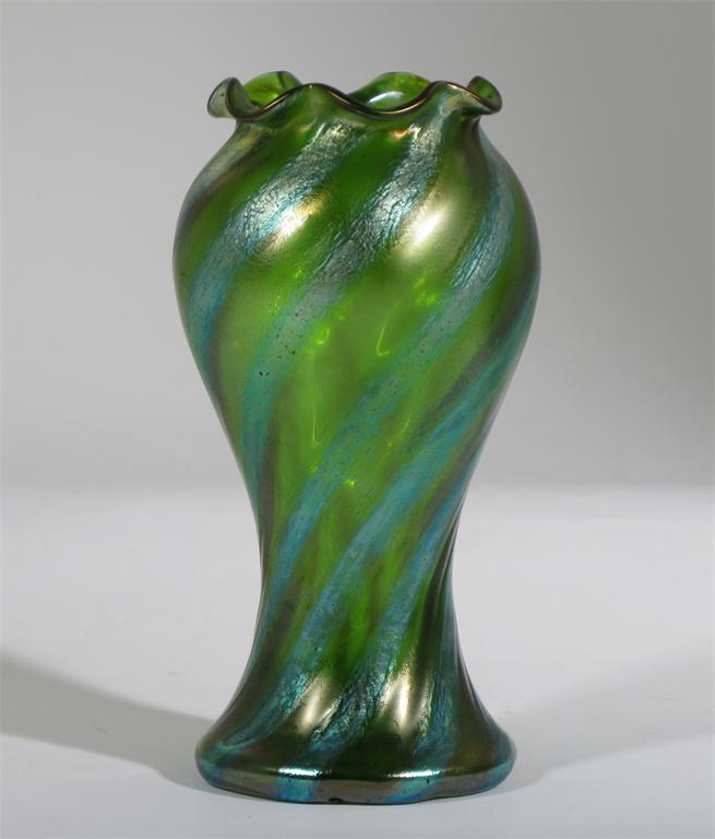 A Loetz glass vase baluster form with everted fluted rim, covered in a spiralling green iridescent finish unsigned 18.5 cm. high