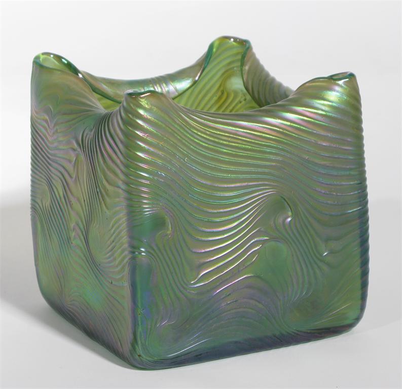 An Austrian glass vase probably by Loetz, in the manner of Koloman Moser, square section with inverted rim, trailed decoration with iridescent finish unsigned 12.5 cm. high
