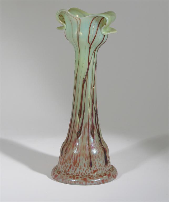 A tall Art Nouveau Palme Koenig glass vase green opalescent glass with pinched rim and handles