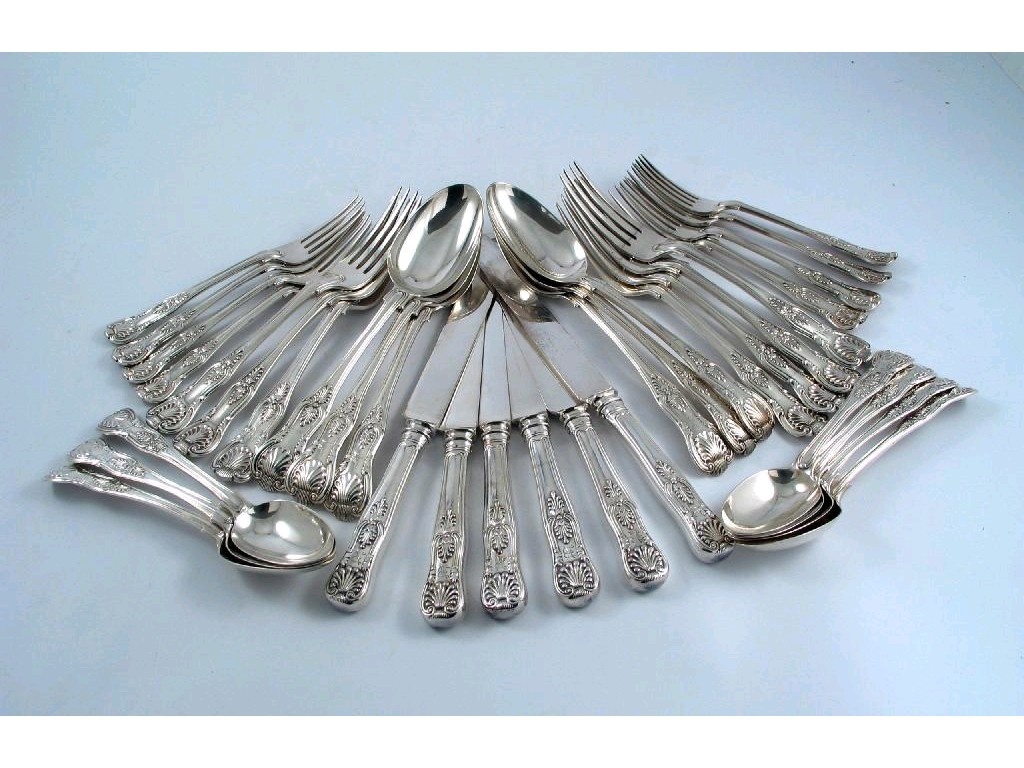 A harlequin or mixed, part canteen of Kings pattern flatware and cutlery comprising:- 6 Victorian tablespoons, 7 tableforks, 7 dessert spoons and 8 dessert forks, (the majority by George Adams) mixed maker's and dates, London 1847-1892 together with 6 non matching tableknives with steel blades by Gorham & Co. (34)