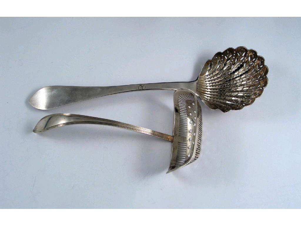Two sugar sifter ladles: a large example stamped "Kohler Jeune", Strasbourg 1819-1838, and a Dutch example 1824, 2.75oz. (2)