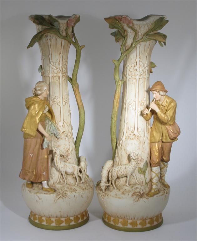 A large pair of Royal Dux vases each modelled in relief, one with a piping shepherd, the other a shepheress feeding goats, glazed in colours applied pink triangle, minor damages 70 cm. high