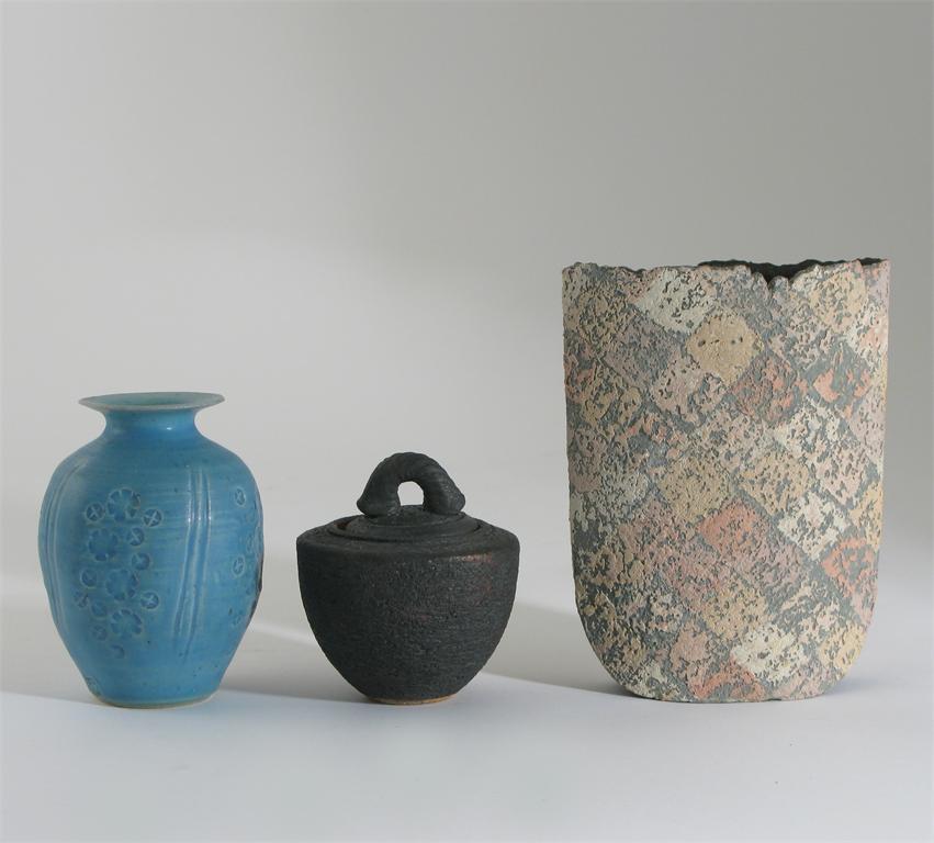 A porcelain vase by Marianne De Trey impressed with panels of decoration under a matt blue glaze