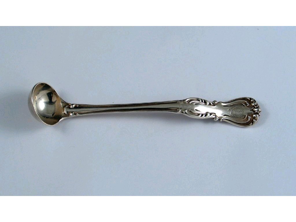 A Victorian Devonshire pattern condiment or cream ladle, crested by George Adams, London, 1844, 1oz.