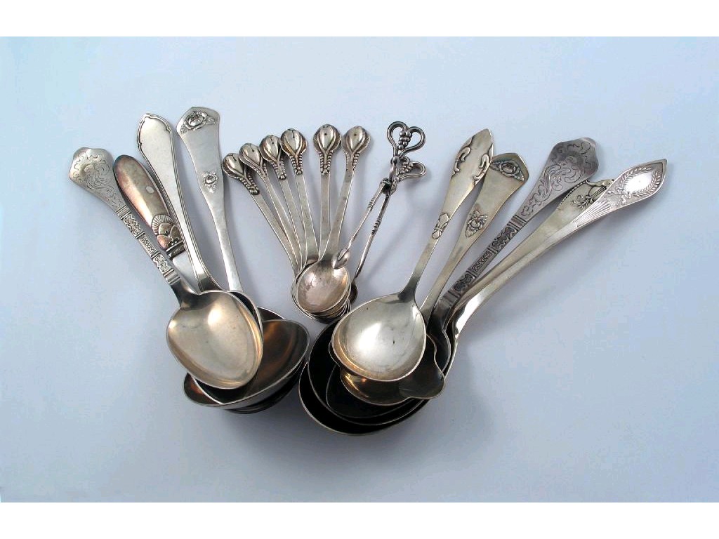 A quantity of Danish flatware: six cast teaspoons, by Evard Nielsen, Copenhagen 1916, a pair of sugar nips, by Georg Jensen, a spoon, by Georg Jensen with a steel bowl, and seven other assorted spoons. (15)