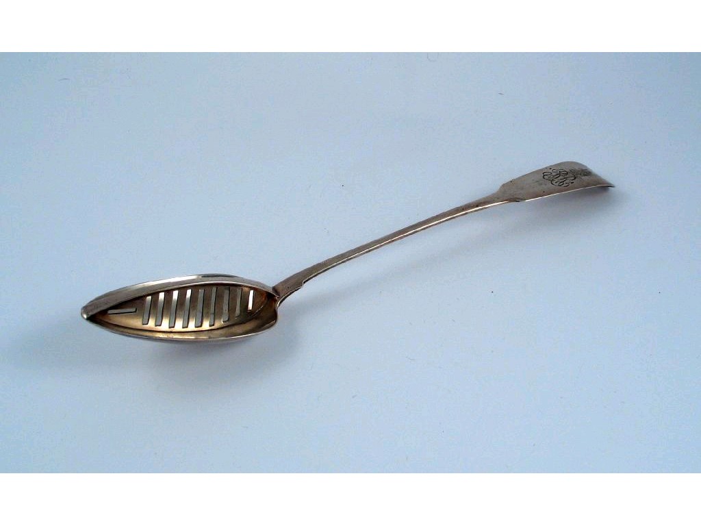 A George III Irish fiddle strainer spoon, basting size engraved with a crest and initials "RR", by S. Neville, Dublin 1812, 13in (33cm) long, 4.5oz.
