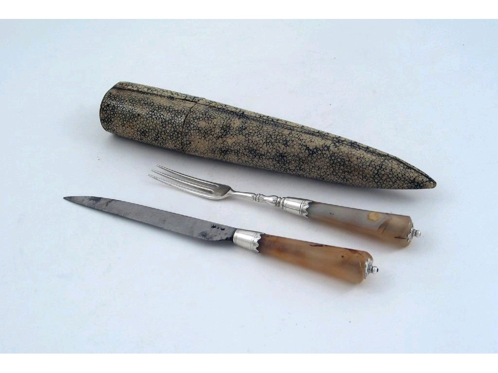 An early 18th century agate handled knife and fork, with engraved ferrules, the tapering handles and engraved end caps with ball finials, the steel knife blade with a cutlers mark, contained in a fitted shagreen case, unmarked, first third of the 18th century, the case 8.5in (21.5cm) long.