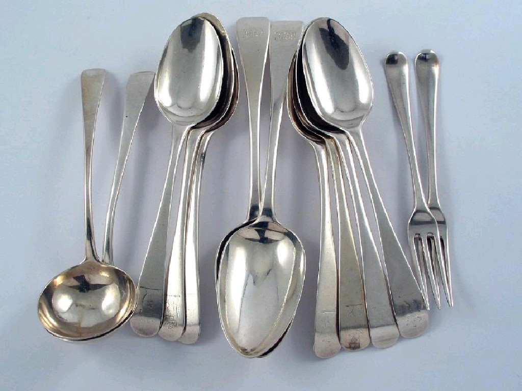 A mixed lot of flatware: Nine assorted antique tablespoons, two George III sauce ladles and two, three prong dessert forks, mixed makers and dates, 22oz. (13)