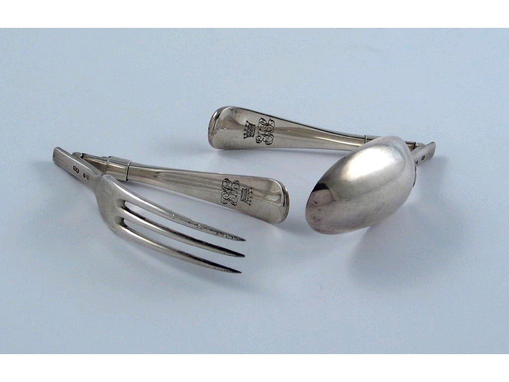 A Victorian folding picnic spoon and fork, (three prong) contained in a leather roll and engraved with an Earl's coronet above the initials 'EHJ' by George Adams, London 1880, 4oz.