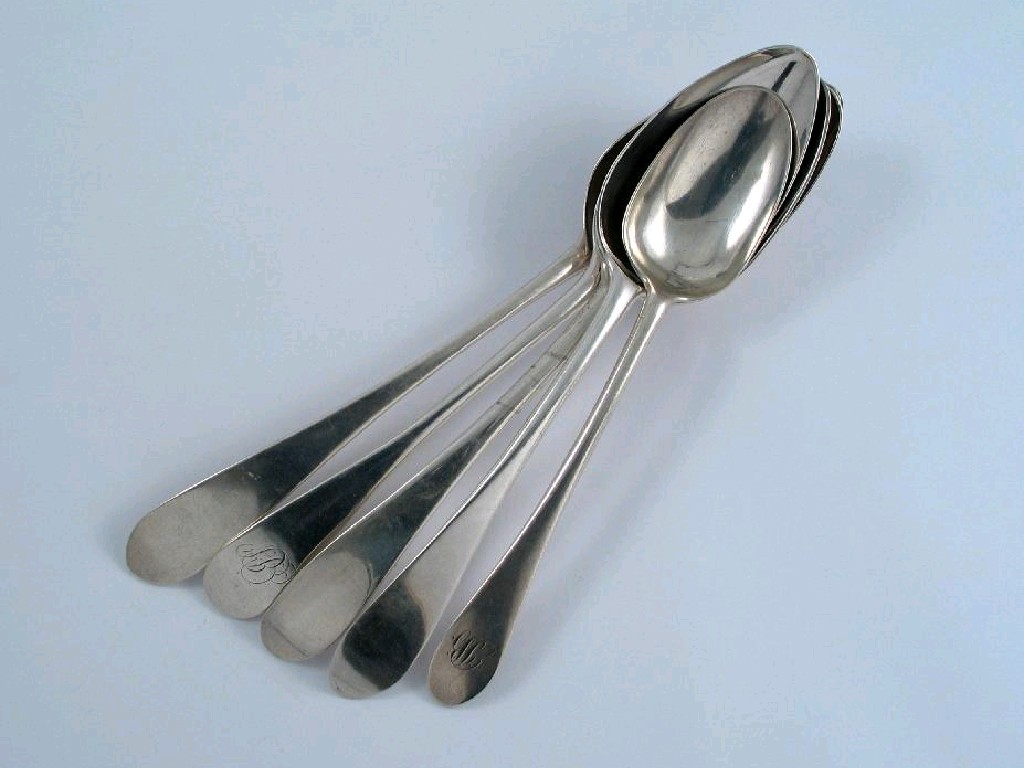 Five Scottish spoons, all Edinburgh-made: a Celtic point tablespoon, by Robert Wilson, 1799, another by Thomas Anderson, 1767, another by Alex Gardner, 1777, another by John Clark, 1769 and a dessert spoon, by James Welch, 1783, 8oz. (6)