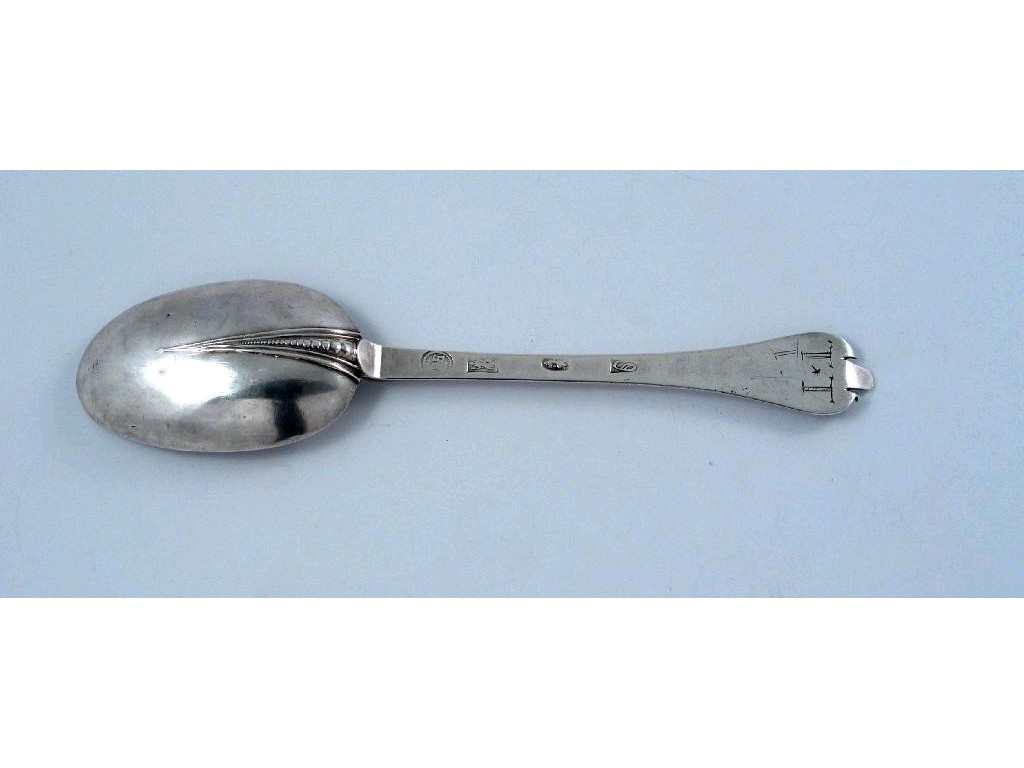 A William III trefid spoon with a bead and reeded rattail, scratched with the initals 'T.T' by William Penstone, Lonodn 1699, 7.6in (19.2cm) long, 1.2oz.