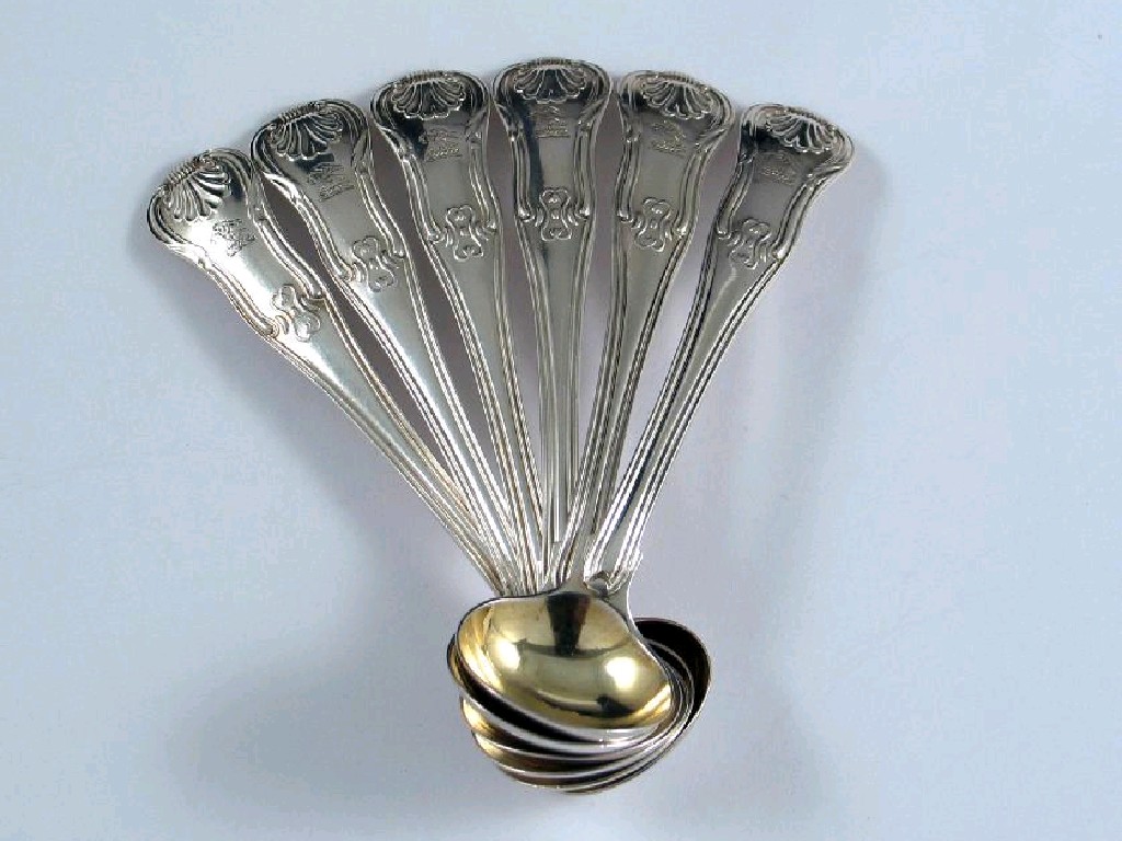 A set of six George III hourglass pattern salt spoons, crested by William Chawner, London 1818, 5oz. (6)