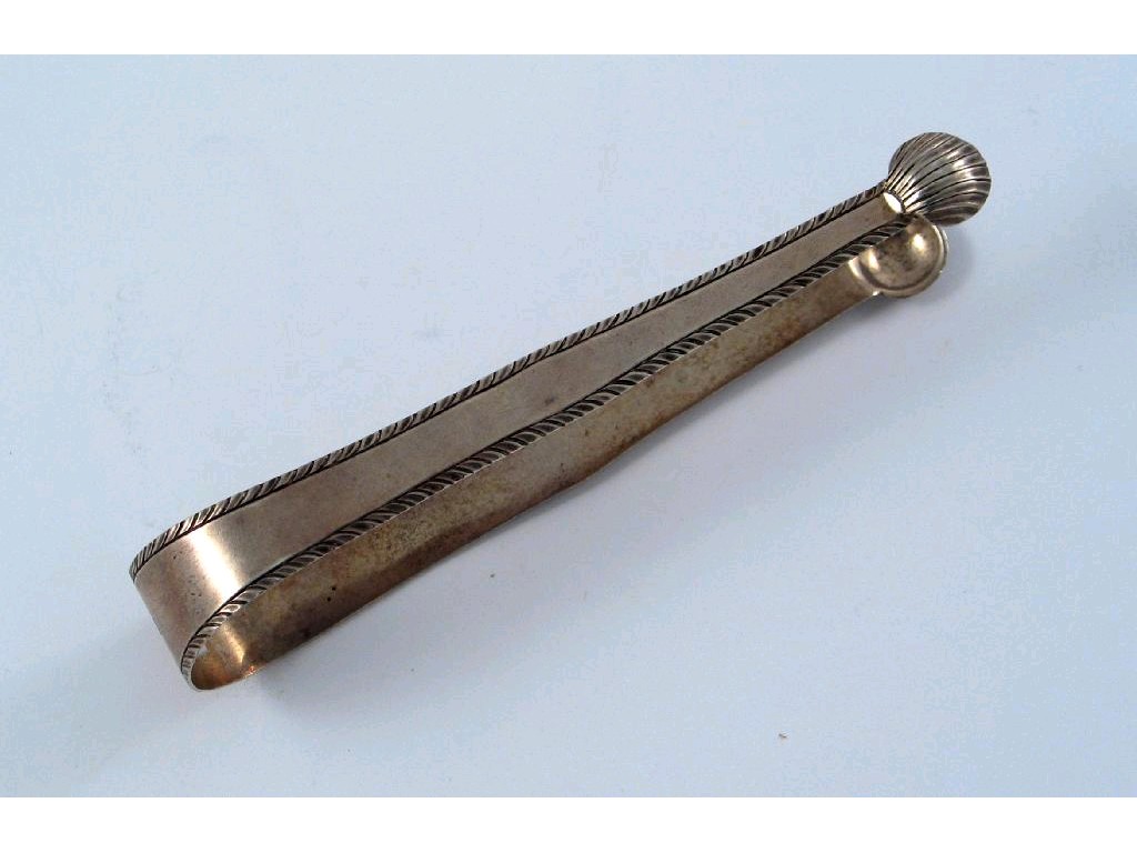 A pair of George III unascribed sugar tongs, with fluted circular bowls and feather edging, initialled 'I.H', maker's mark only, struck twice ('LB' over 'II'), probably provincial, c.1775, 1oz.